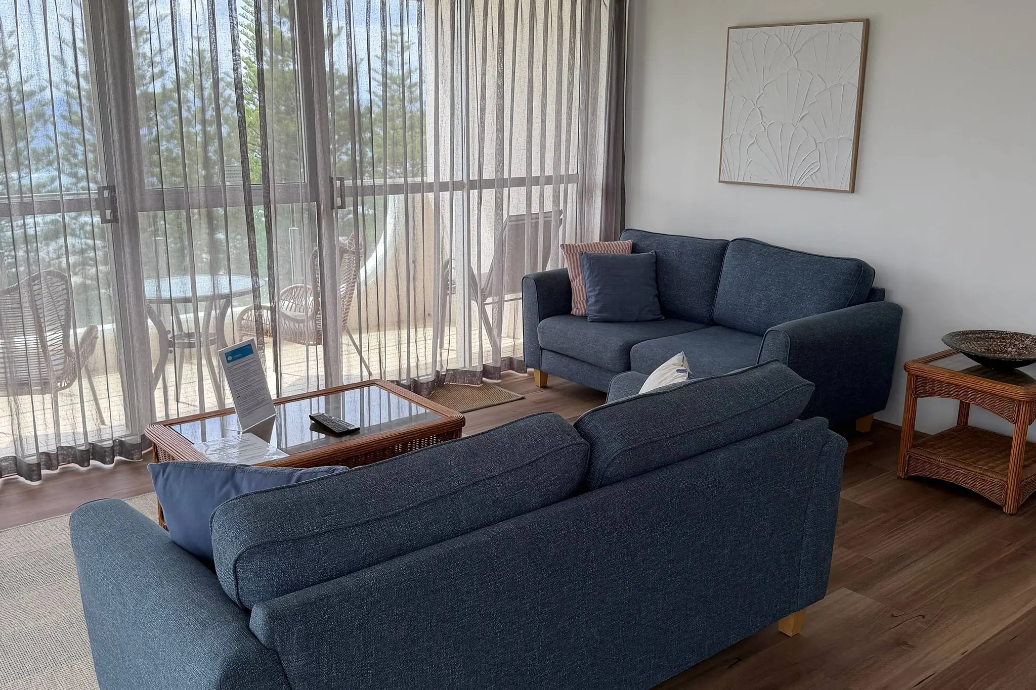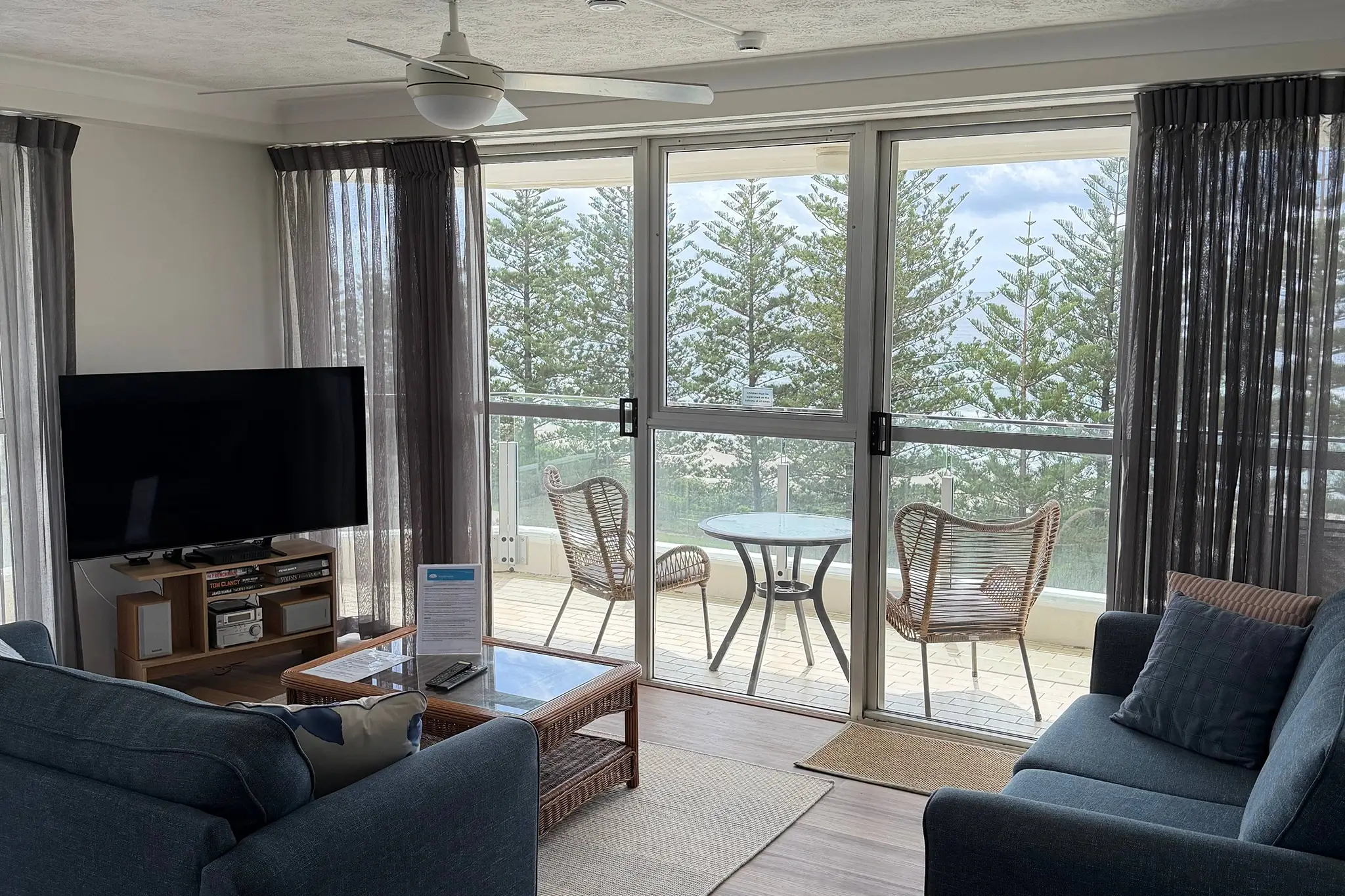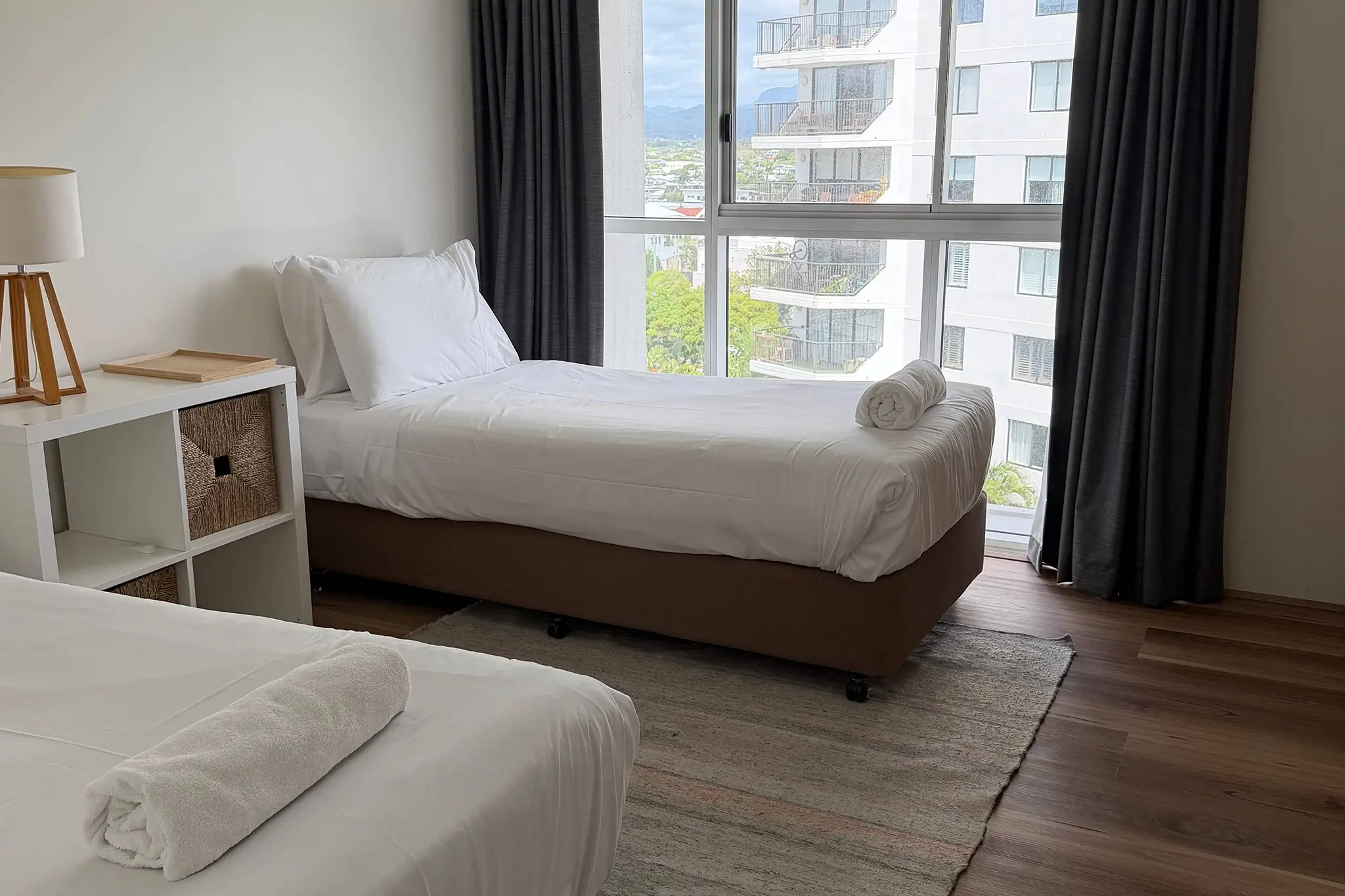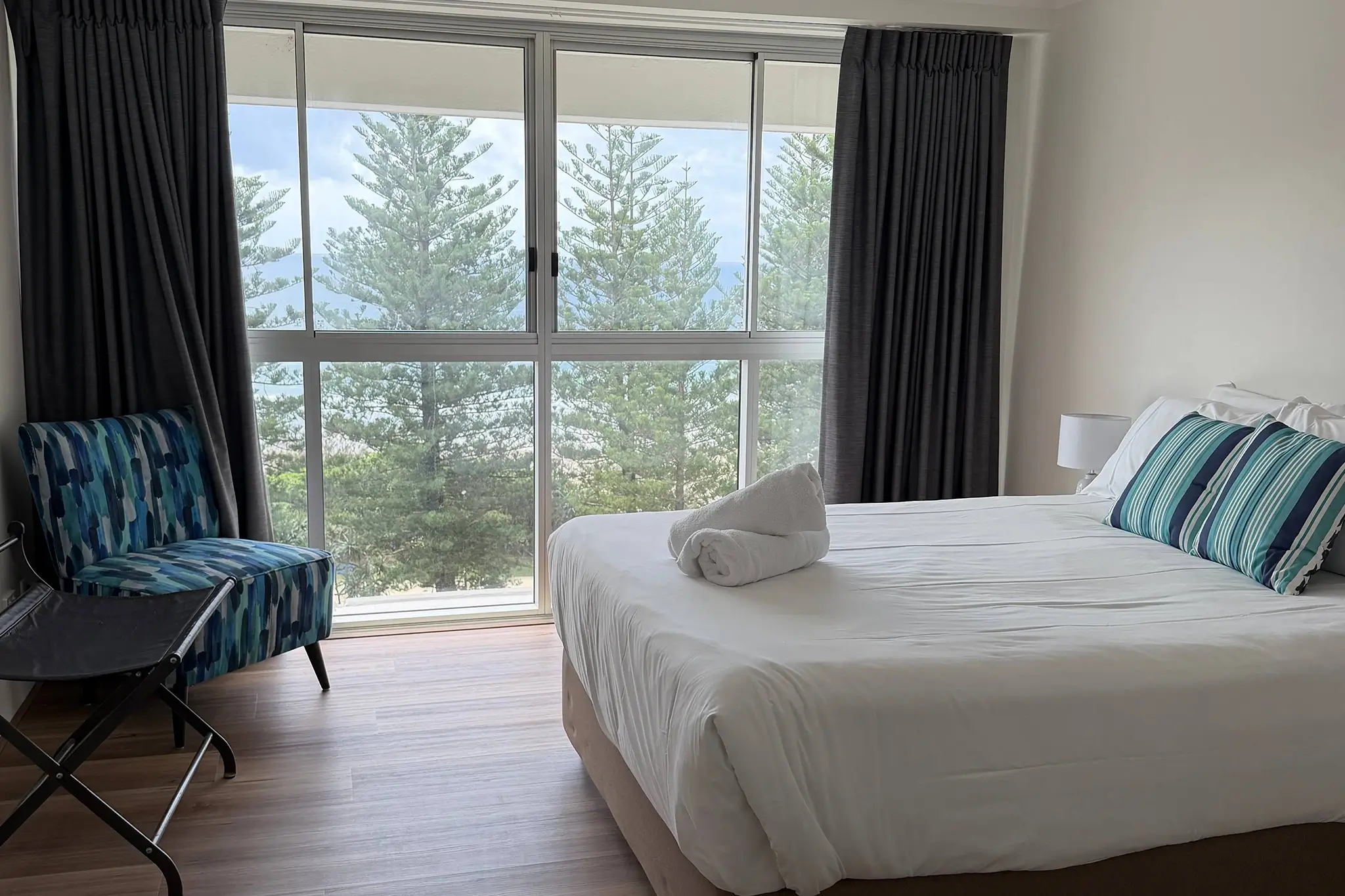 The master bedroom (which features an ensuite bathroom) has ocean views, so you can watch the sunrise from the comfort of your comfy queen size bed. For the kids, or older friends and guests, there’s a second bedroom facing the Hinterland, with two single beds in; which means this gorgeous little slice of Burleigh Swell charm can accommodate 4 guests (or more with one of our rollaway packages).