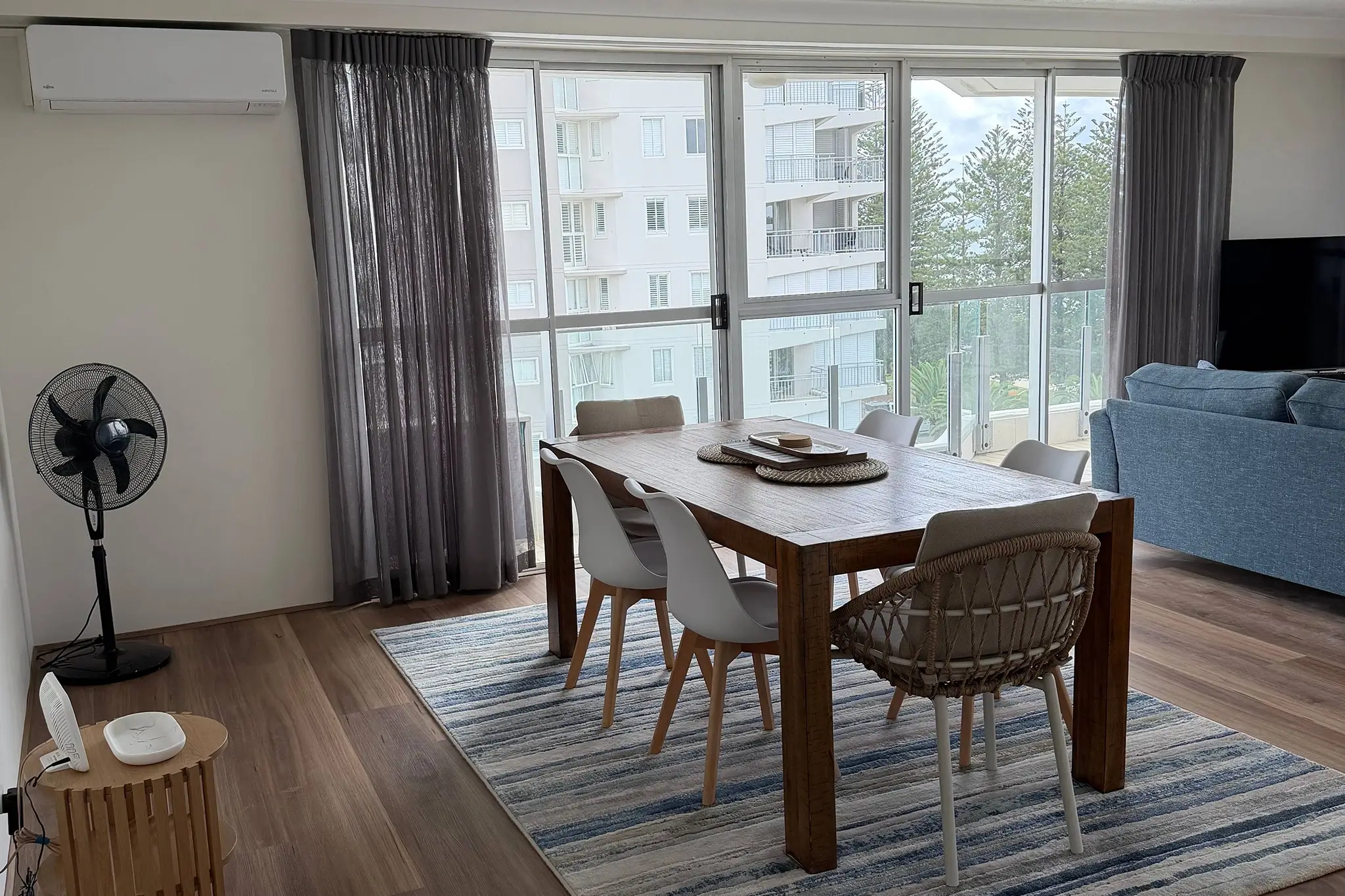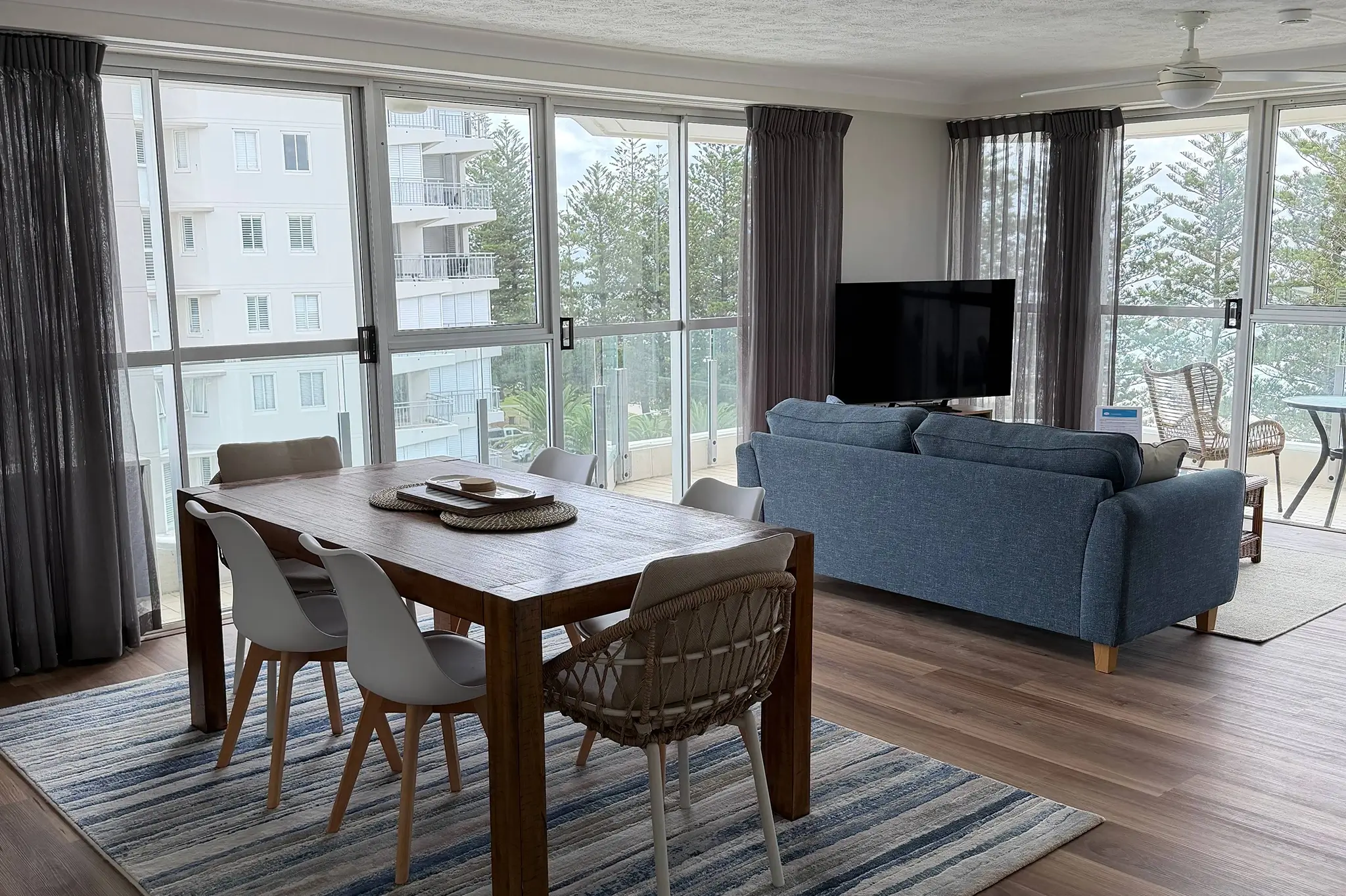 The living and dining is spacious, with enough seating for the whole family. The full kitchen has views out to the Hinterland. The entire living, dining and kitchen area are open plan, which makes the apartment feel light, airy and spacious, while also providing you with ocean views from all of these locations.