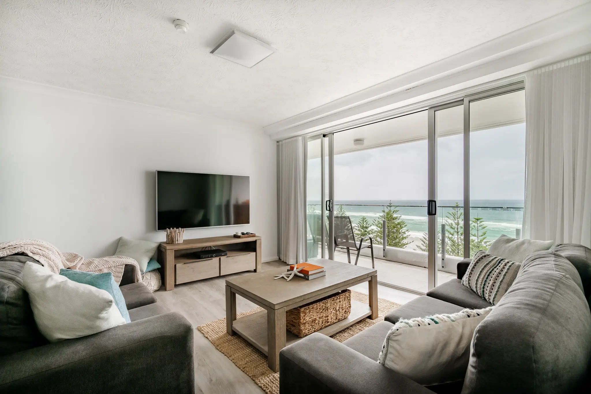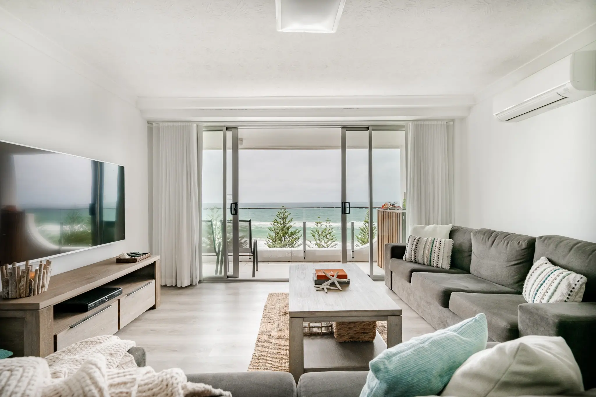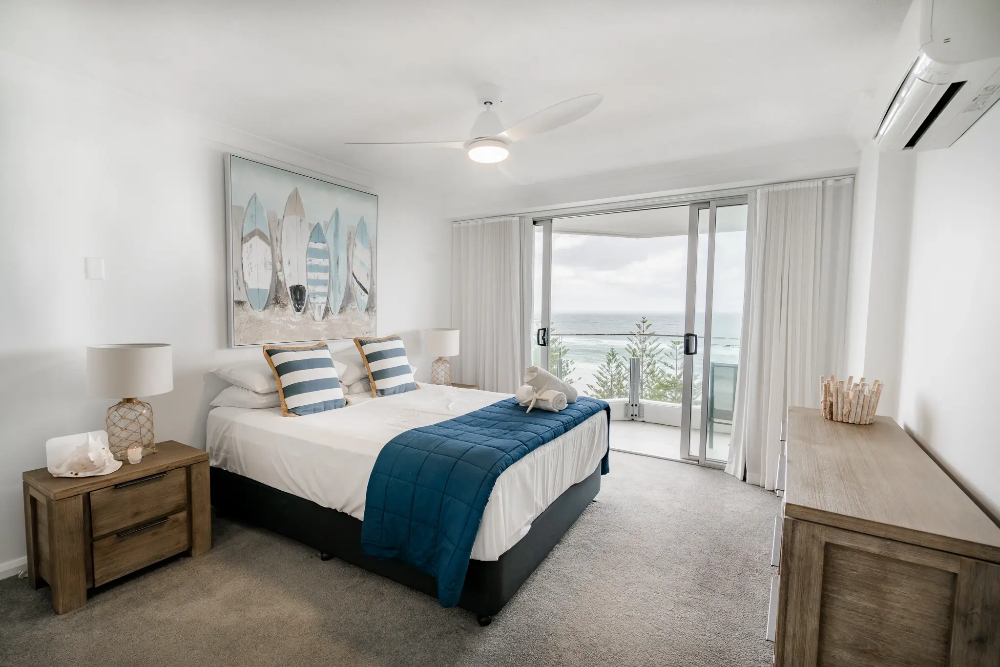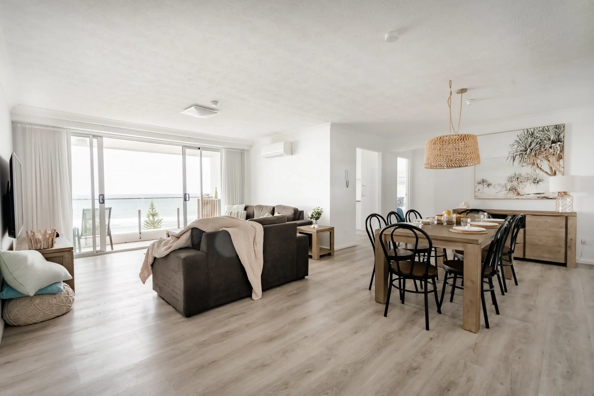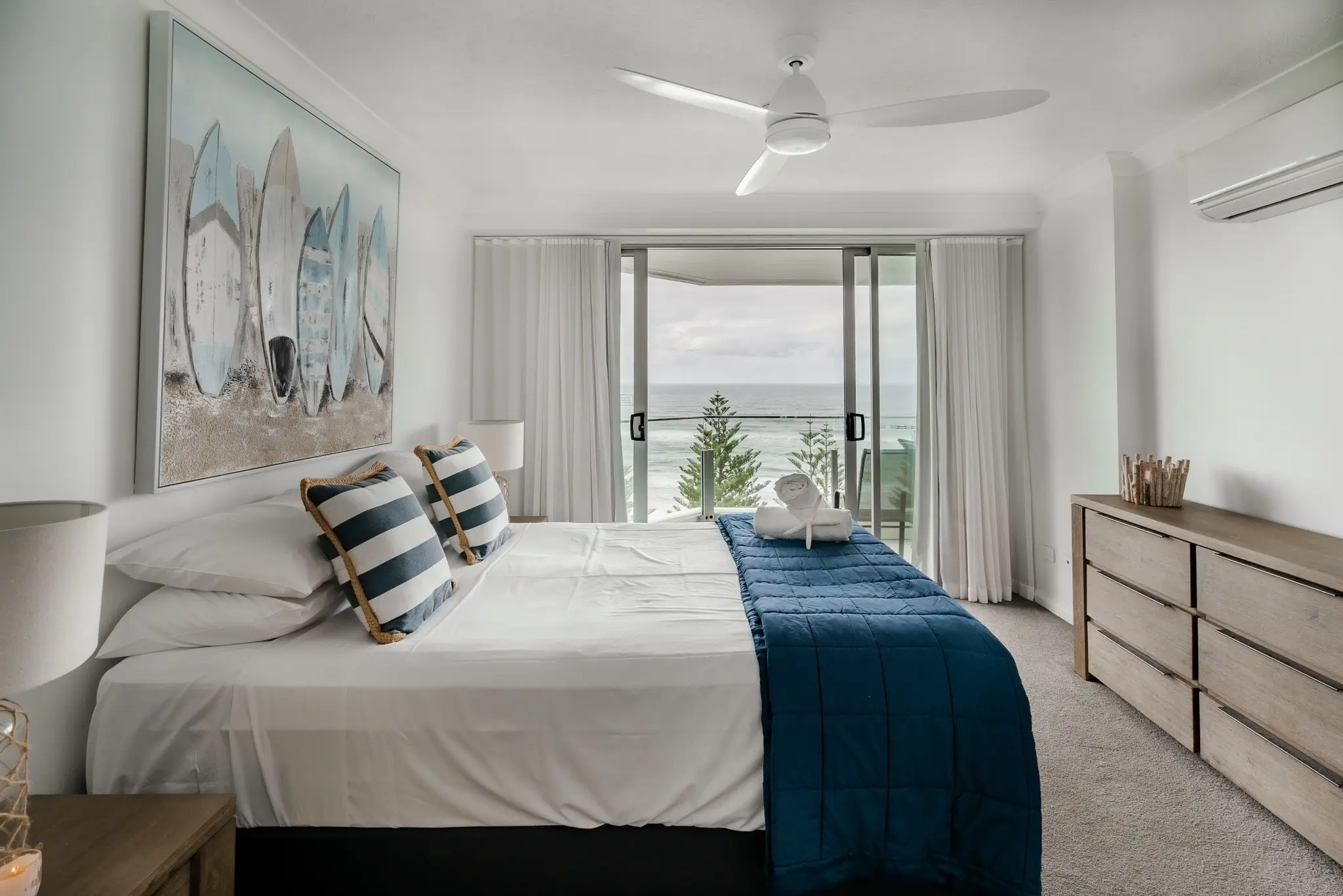Even the massive contemporary dining table (perfect for big family dinners, or luxe coastal dinners with friends) and big flatscreen TV in the living room don’t dwarf this space, which is a testament to just how big this apartment really is. The living and dining, with gorgeous views of the Burleigh Heads coastline, will become one of your go to vacation locations, and it’s easy to settle in here for a long stay.