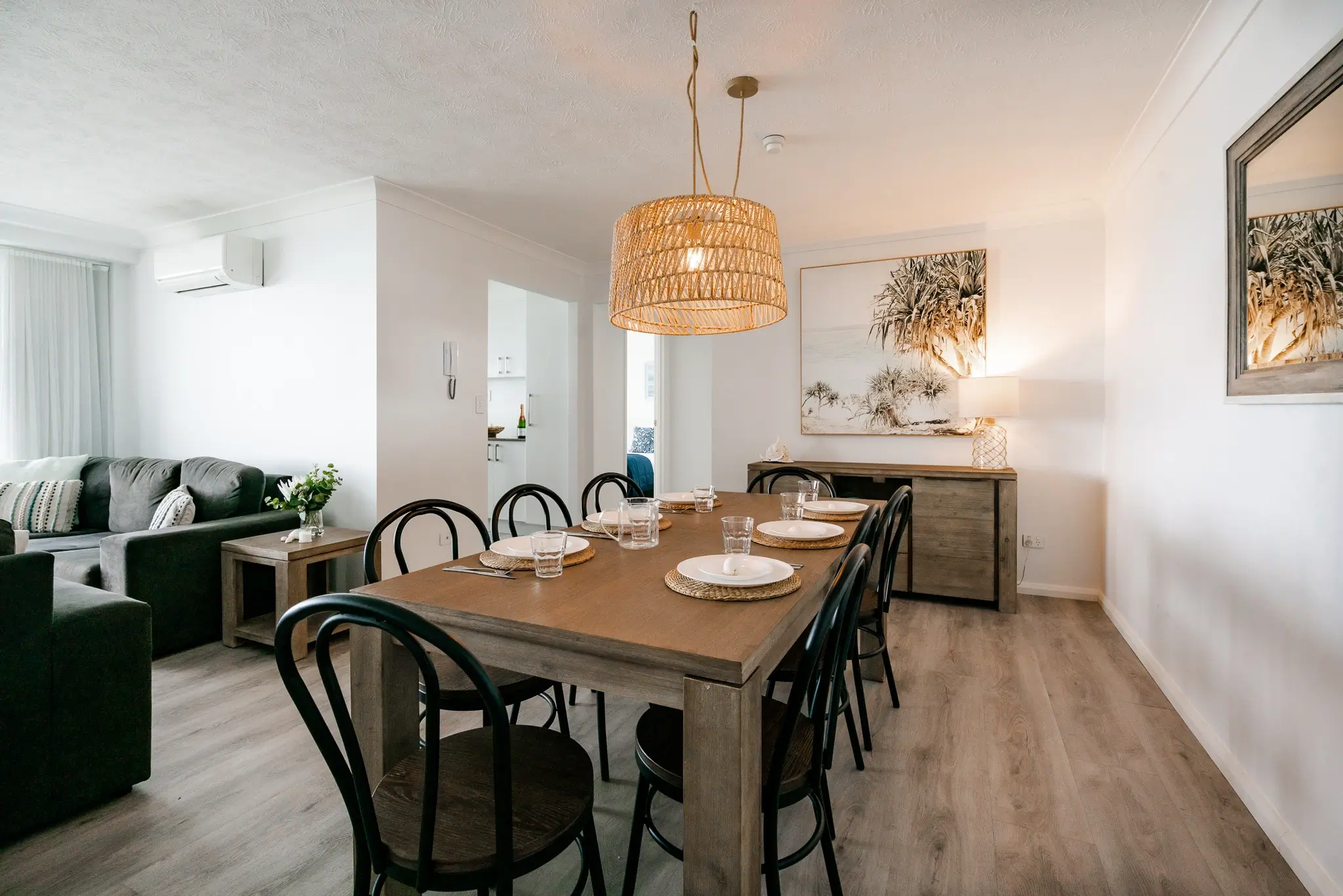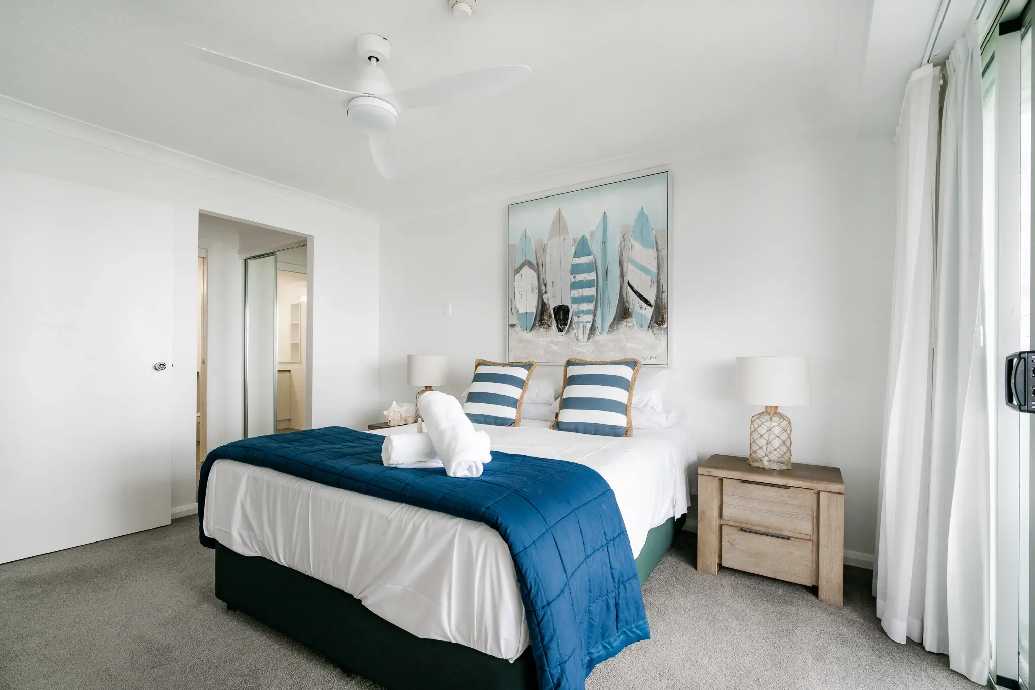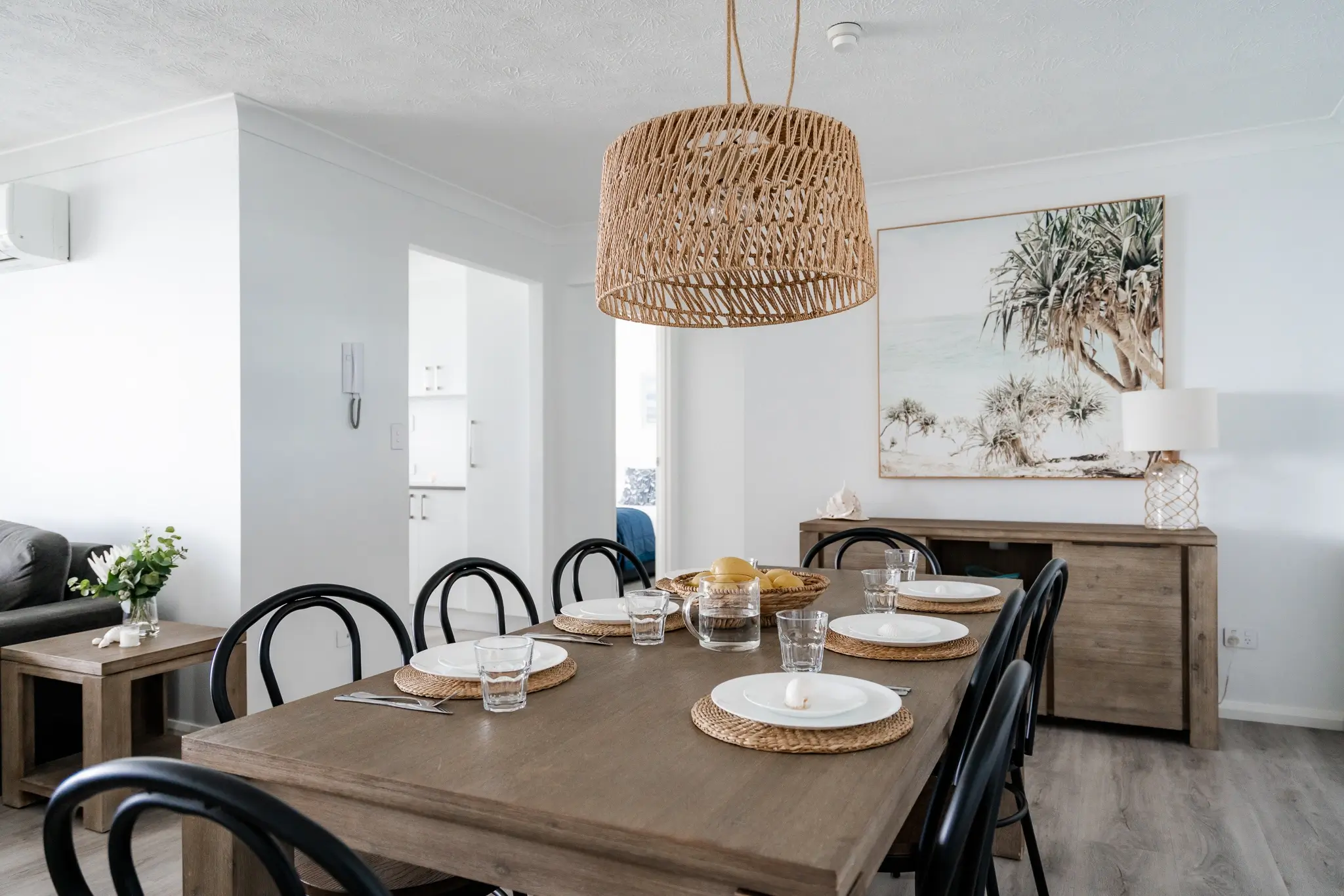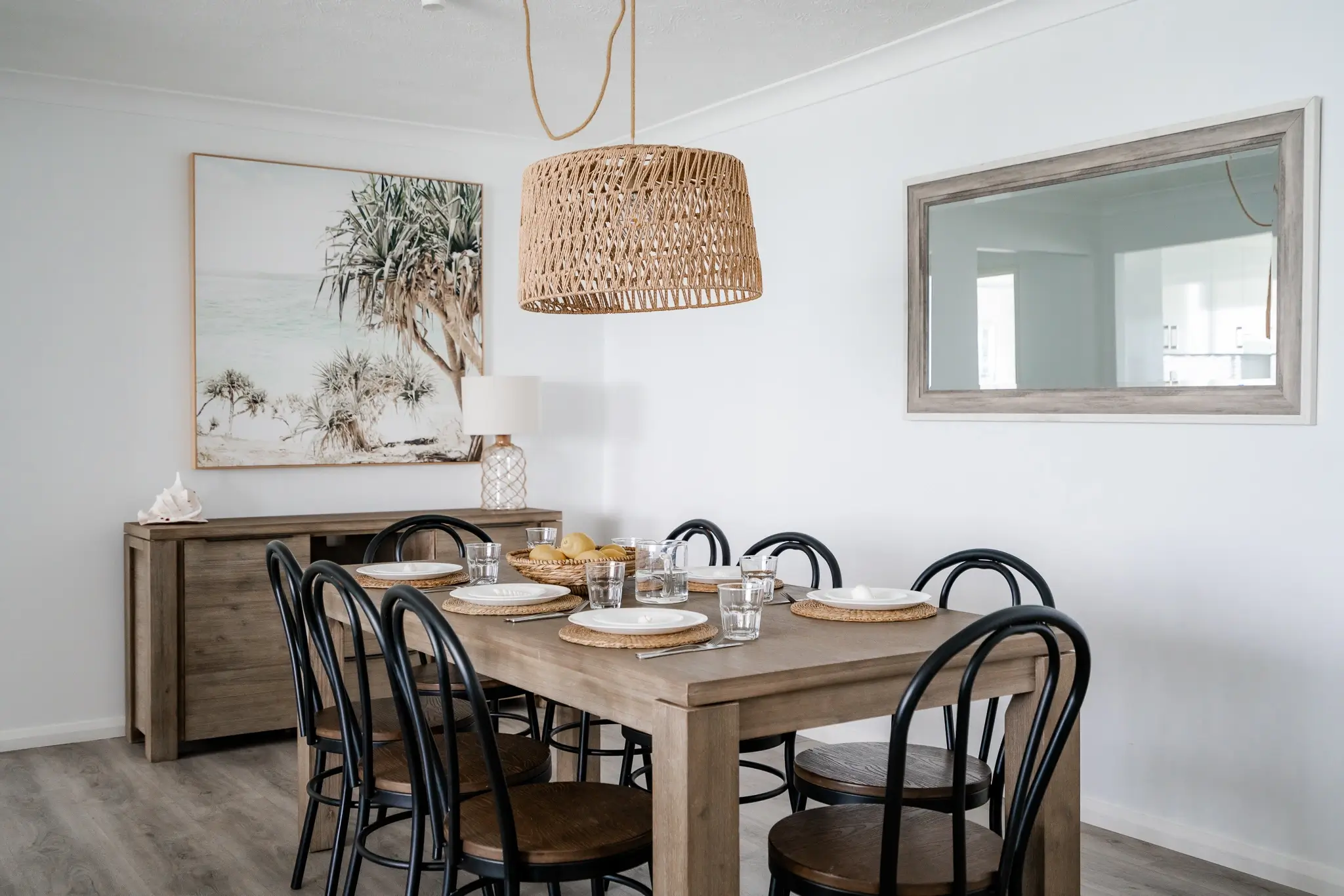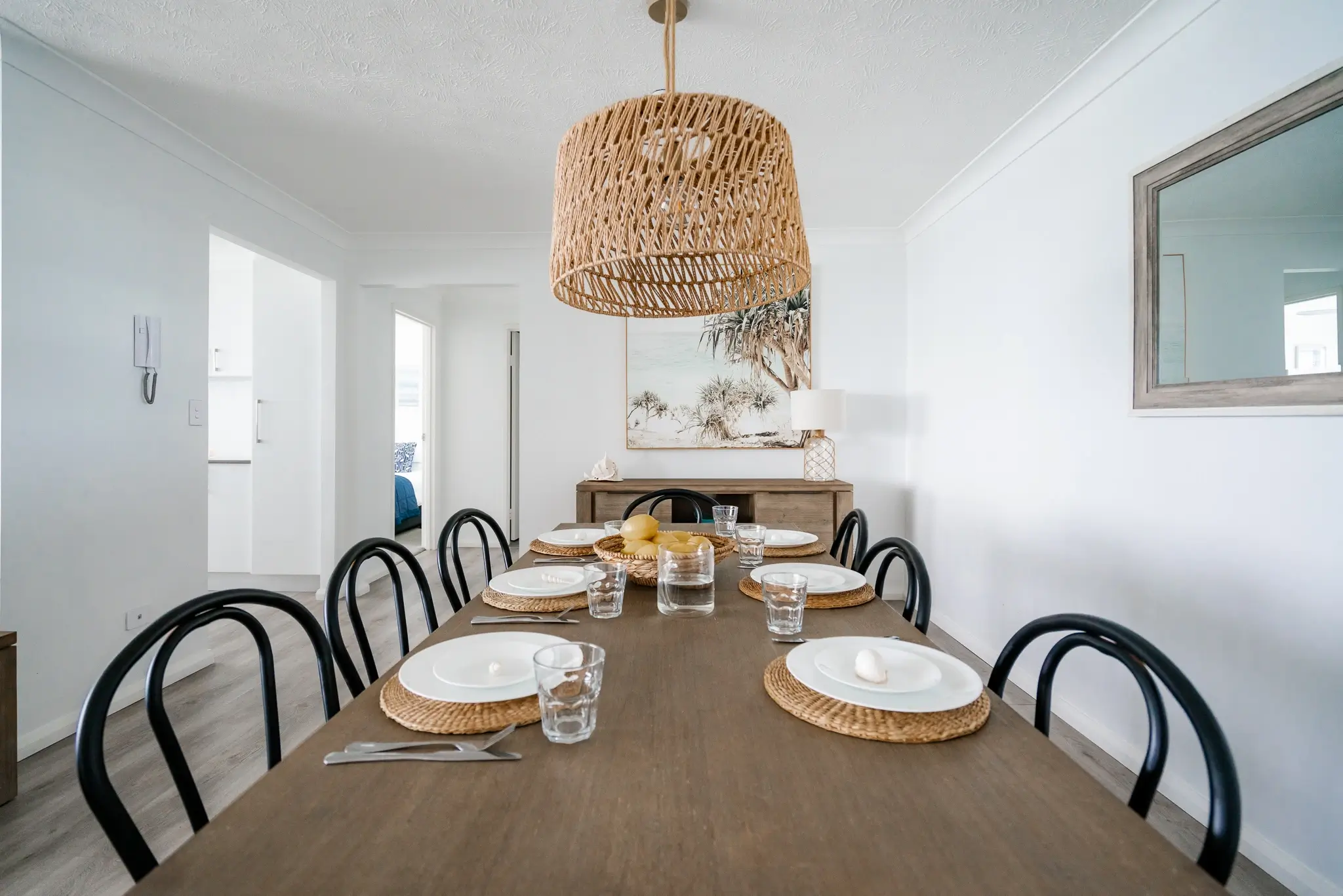 Even the massive contemporary dining table (perfect for big family dinners, or luxe coastal dinners with friends) and big flatscreen TV in the living room don’t dwarf this space, which is a testament to just how big this apartment really is. The living and dining, with gorgeous views of the Burleigh Heads coastline, will become one of your go to vacation locations, and it’s easy to settle in here for a long stay.