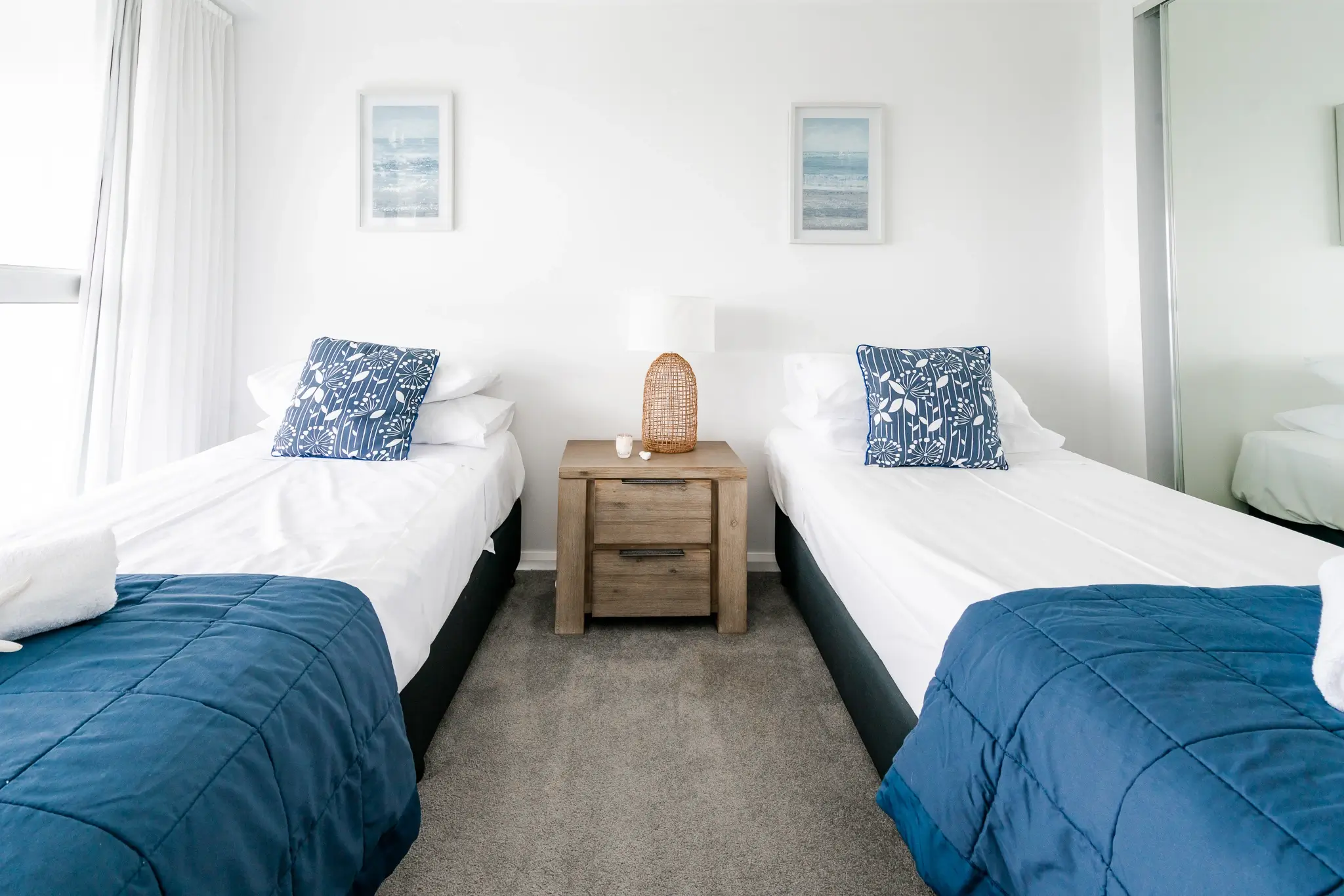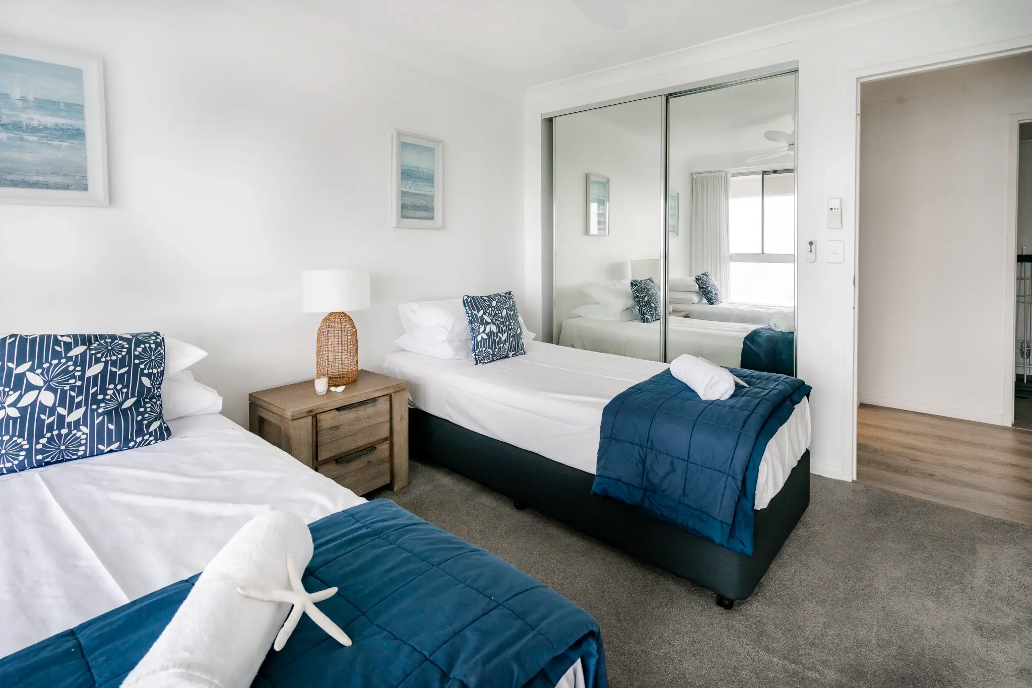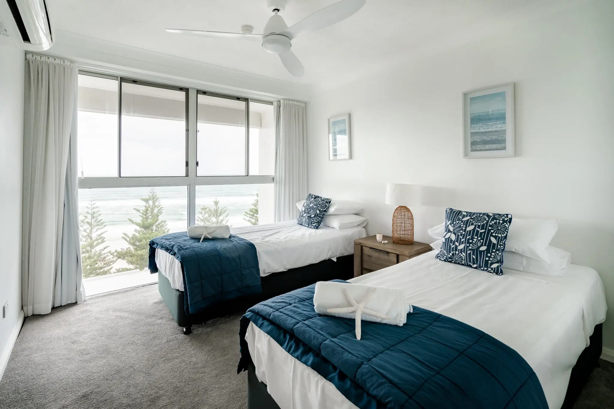The kitchen is modern and large, with everything you need to make this feel like home. The master bedroom (with full ensuite) is gorgeously furnished, and has views out across the Burleigh headland. The second bedroom has two singles, also with views, although these look out to north Burleigh Headland and up the coast to Surfers Paradise.